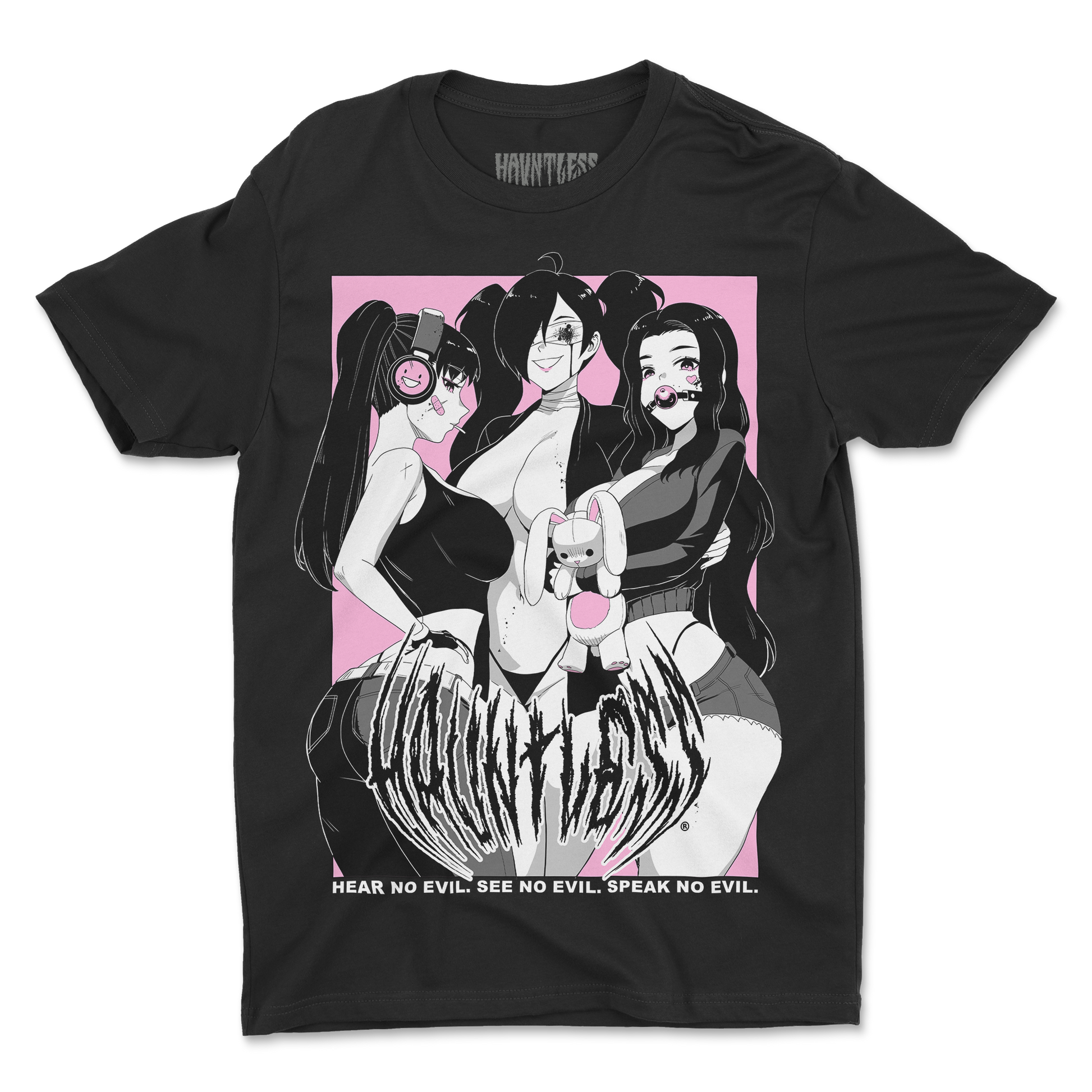 Our Evils Tee brings twisted tradition to life with three sinfully seductive girls channeling the classic “no evil” mantra—Hauntless style. Whether you're feeling silent, savage, or just straight-up soulless, this tee's got your mood covered. Literally.